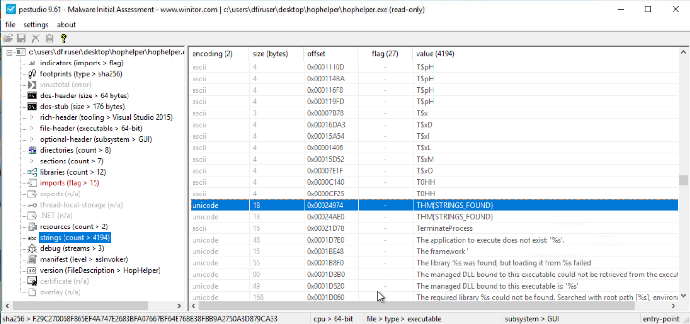 For this we will need to use PeStudio which is included in the VM. Once it’s open we can simply drag and drop HopHelper.exe (located in a folder on the desktop) inside and see various properties of the program, including the SHA256 hashsum.