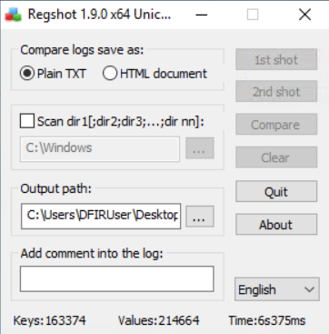 To find this we need to use Regshot, a tool that takes snapshots of the Windows registry before and after running malware to identify changes. First, I opened Regshot and set the output to save to the desktop for ease. With that done I took the 1st shot.