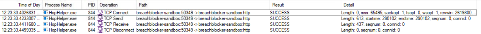 Dynamic analysis: Filter the output of ProcMon for “TCP” operations. What network protocol is HopHelper.exe using to communicate?