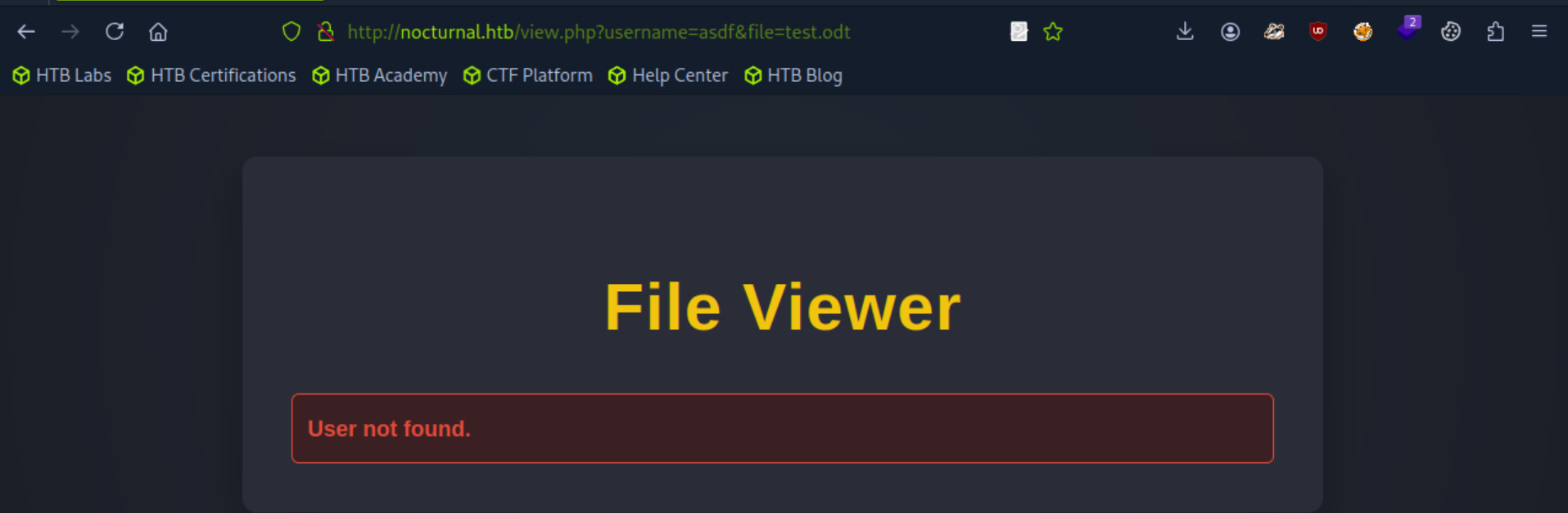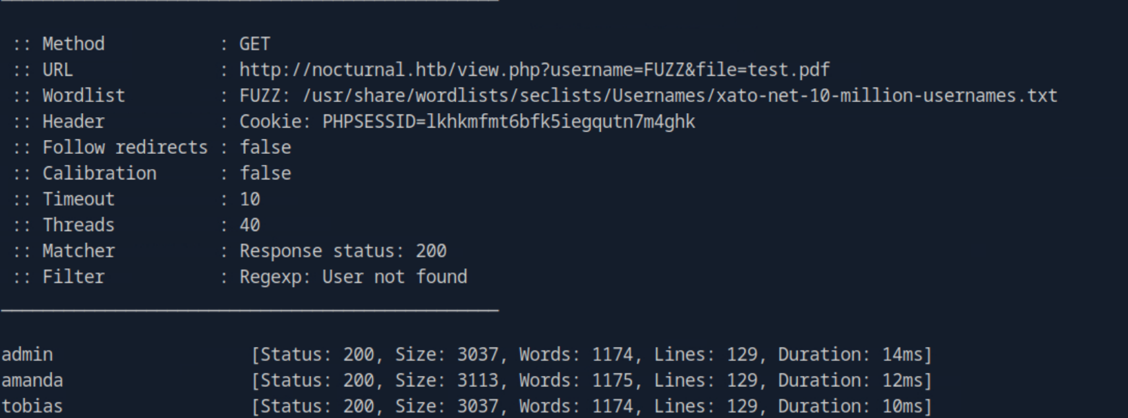 ffuf -u "http://nocturnal.htb/view.php?username=FUZZ&file=test.pdf" -w /usr/share/wordlists/seclists/Usernames/xato-net-10-million-usernames.txt -b "PHPSESSID=lkhkmfmt6bfk5iegqutn7m4ghk" -mc 200 -fr "User not found"