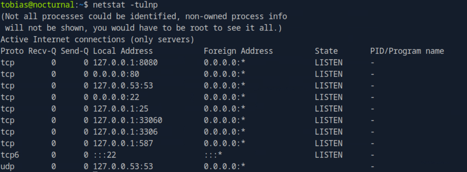 Looking at the output of netstat -tulnp I could see that there was something listening on port 8080, however it was only accessible through the localhost. Utilizing Local port forwarding via SSH I was able to connect to the service using the command ssh -L 9000:127.0.0.1:8080 tobias@nocturnal.htb and visiting http://127.0.0.1:9000 on my web browser.