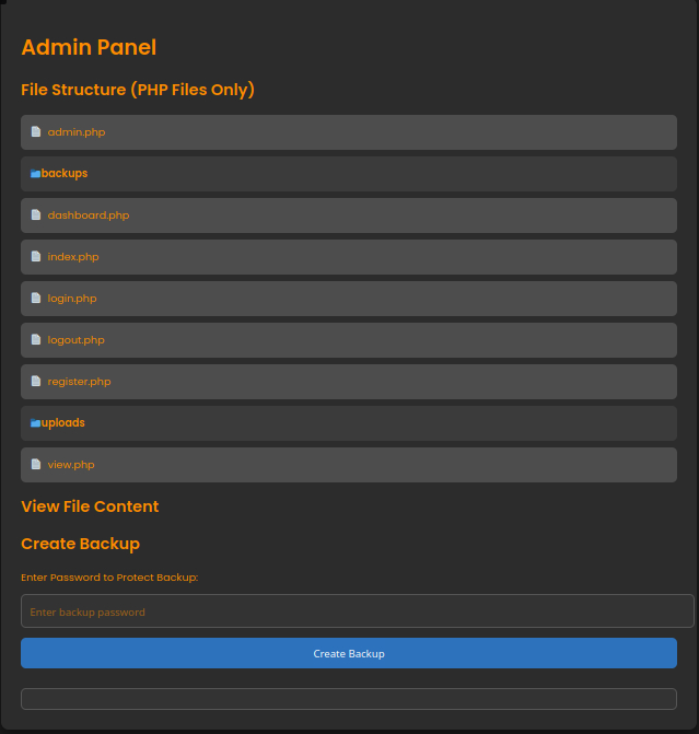 The admin panel had two useful things. Firstly, it showed the .php files related to the webapp, which allowed me to see how the backend of the webapp functioned. Secondly, it allowed us to download an encrypted backup of the website files using a password which I could set, giving us access to an input field which could potentially be vulnerable.