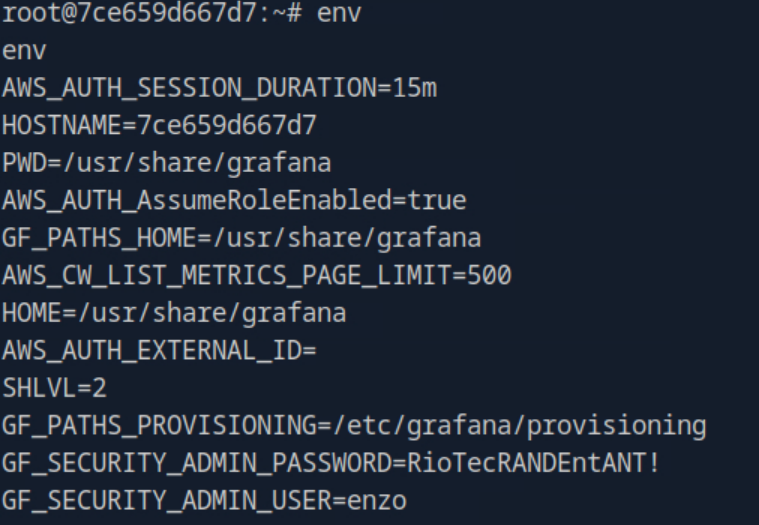The GF_SECURITY_ADMIN_PASSWORD and GF_SECURITY_ADMIN_USER stood out, containing the credentials enzo / RioTecRANDEntANT!.