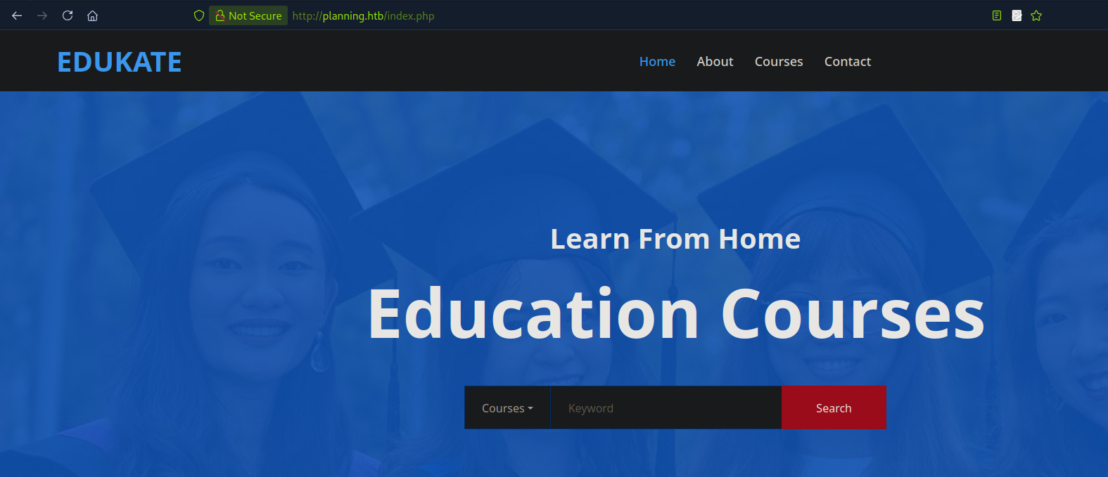 Seeing how that is a vulnerable version of ssh I proceeded to add planning.htb to my hosts file and visited the website, which led me to the landing page of a site named “Edukate” that seemingly had something to do with online classes.
