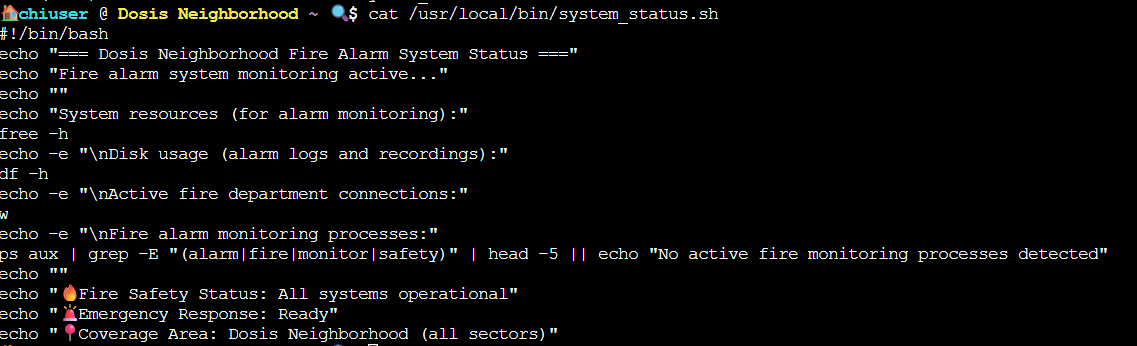 Doing so revealed a few interesting things. The first is that we have a folder in our home directory named bin, which contains a file runtoanswer which is actually a symlink to /etc/firealarm/restore_fire_alarm, the program we are trying to run in this challenge. The second is that the secure_path in sudo includes /home/chiuser/bin FIRST before the system paths, which is a path we have write access to. The third thing of note is env_keep+=PATH in the sudo -l output, which means our path is preserved when running commands with sudo which opens up the possibility of path hijacking. The final thing of note is that we have sudo permissions for the script /usr/local/bin/system_status.sh. Figuring that the system_status script was likely our way to escalate privileges I checked what it does using cat.