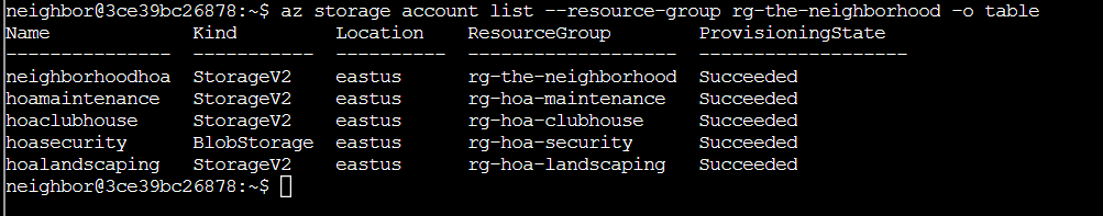 This showed us the 5 resource groups available in this tenant. We are then asked to find the storage accounts with the command az storage account list --resource-group rg-the-neighborhood -o table