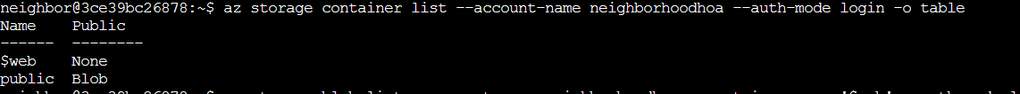 It worked! neighborhoodhoa does in fact have a static website set up. Now we need to see what containers exist in the account so I ran the command az storage container list --account-name neighborhoodhoa --auth-mode login -o table