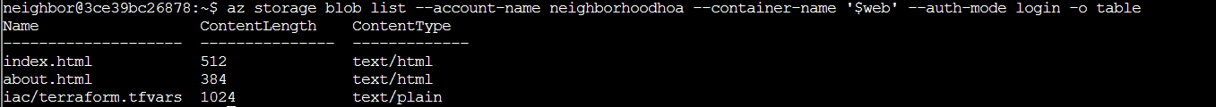 The “$web” container stood out as it hosts the static website, so I checked its contents with az storage blob list --account-name neighborhoodhoa --container-name '$web' --auth-mode login -o table