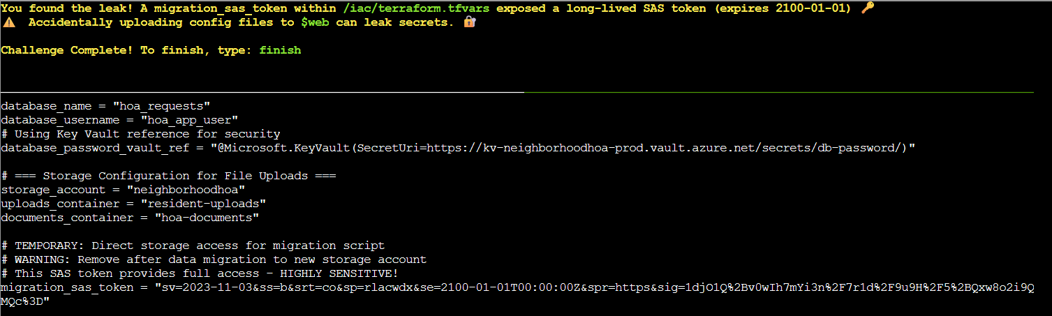 The last file on the list ‘iac/terraform.tfvars’ is a Terraform infrastructure configuration file that should not be publicly accessible on a static website and likely contains the key we’re looking for. Taking a look into it with az storage blob download --account-name neighborhoodhoa --container-name '$web' --name iac/terraform.tfvars --file /dev/stdout --auth-mode login I found what was wrong.