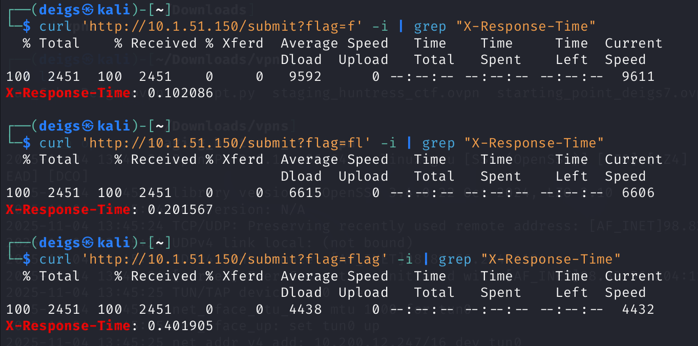 Deciding to test the /submit endpoint I realized that the application worked by sending the users input via a HTTP GET request and returning a response. Since this is a Huntress CTF challenge I assumed the flag would follow the common format of starting with flag{, so I sent that as my input and realized that the X-Response-Time: increased from being essentially 0 to being 500ms. Further testing of the payloads f, fl, fla, and flag revealed an interesting behavior: each correct character increased the servers response time by 100ms.