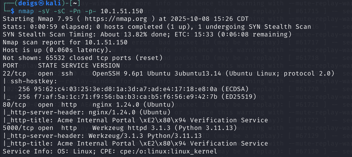 While I was fairly certain that the key to solving this challenge was using the timing response header to brute force each character I accepted that my current methodology had hit a dead end, so I decided to enumerate the machine further. As mentioned above I already ran a gobuster scan and found very little but I had not ran an nmap scan, so I proceeded to do that.