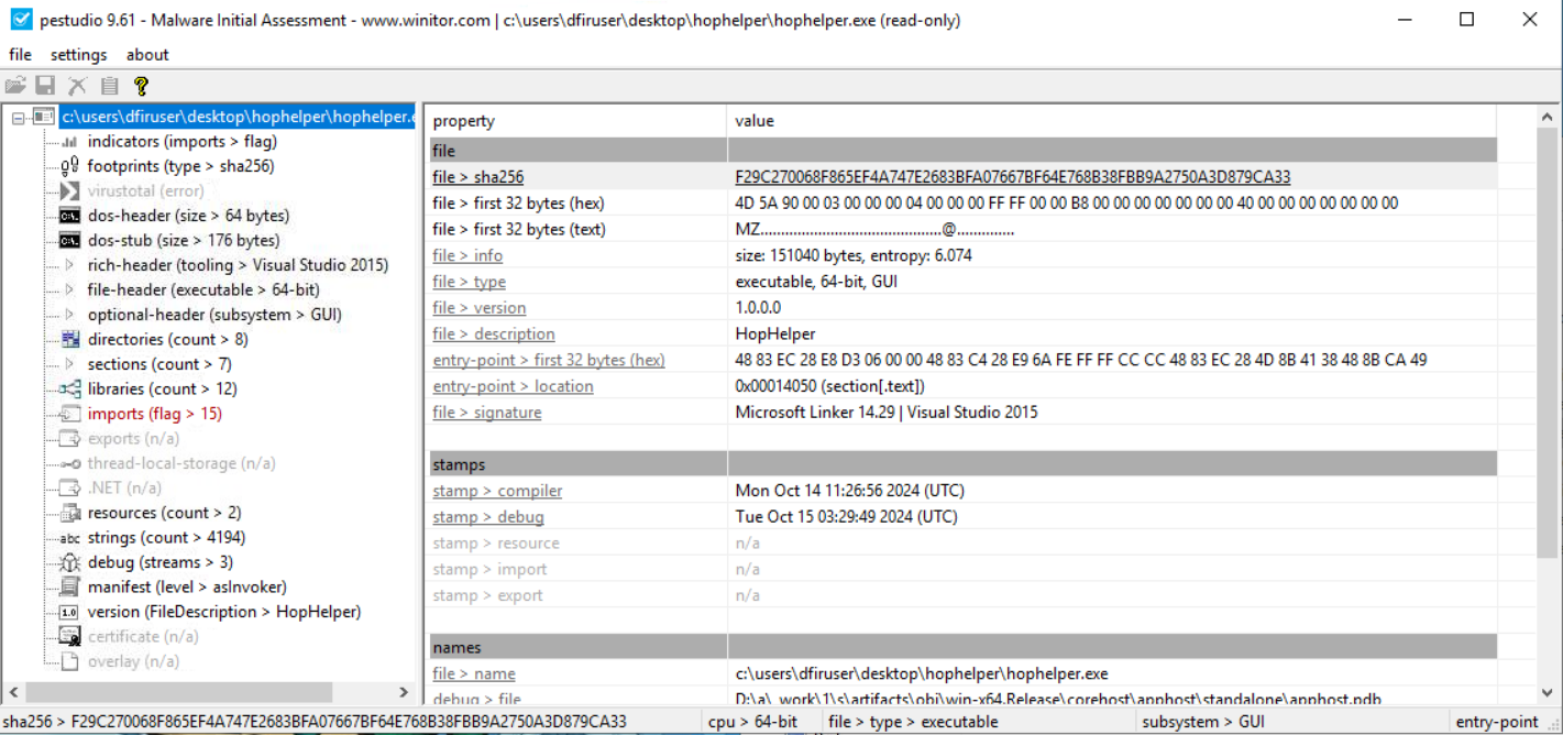For this we will need to use PeStudio which is included in the VM. Once it’s open we can simply drag and drop HopHelper.exe (located in a folder on the desktop) inside and see various properties of the program, including the SHA256 hashsum.