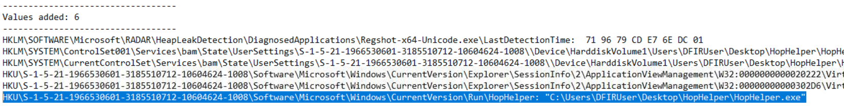 Doing so opens up a text file with all of the registry keys added and modified between the snapshots. In the Values added section we see a key added to the HKU\S-1-5-21-1966530601-3185510712-10604624-1008\Software\Microsoft\Windows\CurrentVersion\Run\ part of the registry, specifically a value named HopHelper. This registry location is used for persistence because any program listed in this registry key automatically executes when the user logs in, ensuring the malware runs every time the system boots.