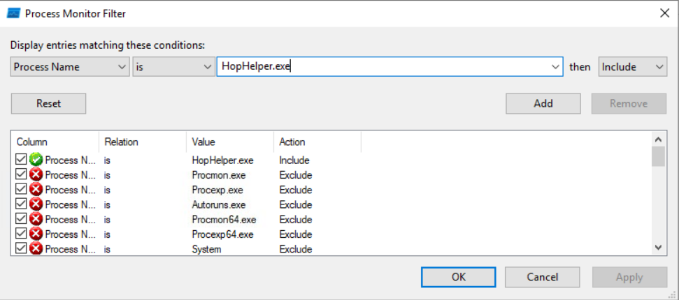 For this we need to run ProcMon, which is located on the desktop of the machine. While capture is on (indicated by the play button in the toolbar showing a red circle when actively capturing), I ran HopHelper.exe again and waited for it to finish. Once that was done I opened the filter tool and added a filter for Process Name is HopHelper.exe then Include.