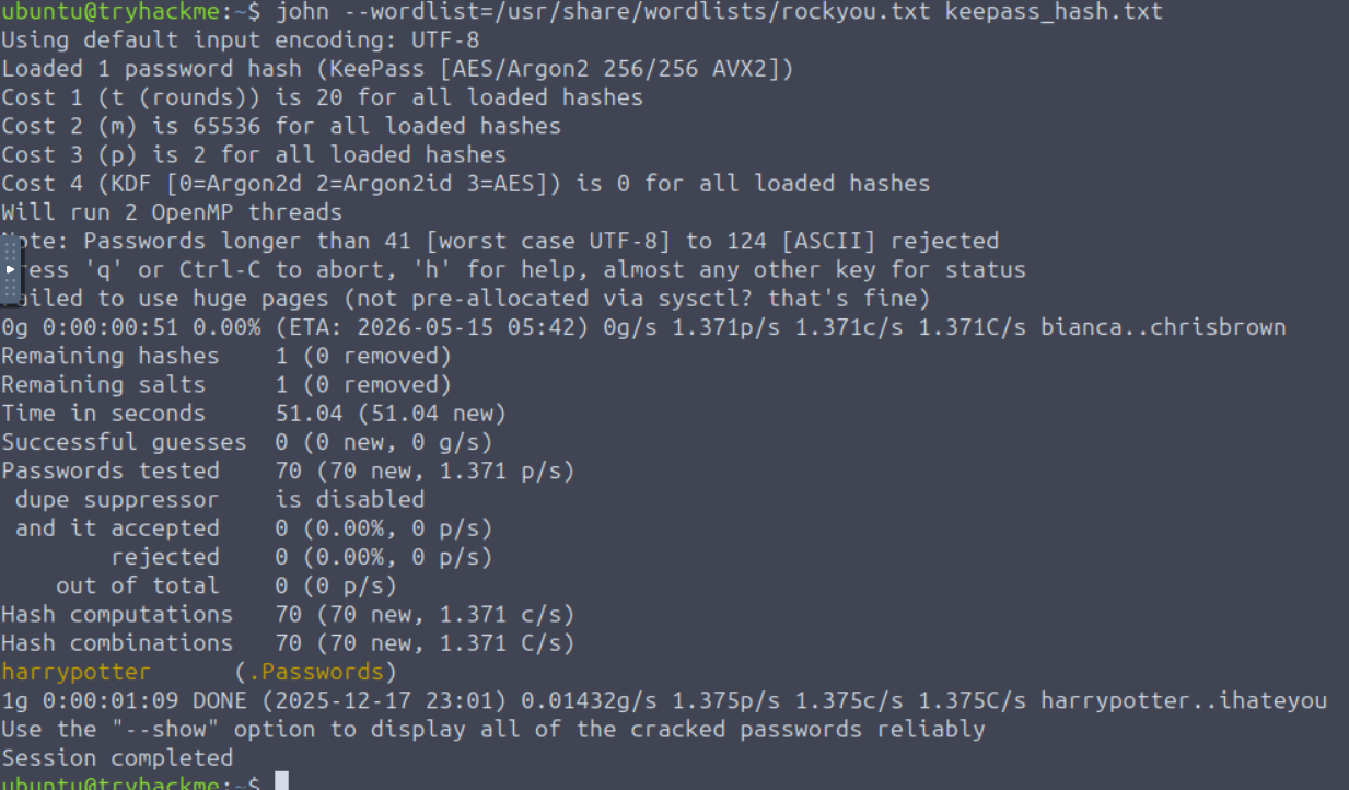 The keepass2john command wasn’t available in the standard PATH on THM’s machine, but it was available in the ~/Desktop/john/run/ directory. To specify it to run directly from that directory I ended up running the command ~/Desktop/john/run/keepass2john ~/.Passwords.kdbx > ~/keepass_hash.txt. Now that we had keepass_hash.txt we just had to run john --wordlist=/usr/share/wordlists/rockyou.txt keepass_hash.txt and wait to see if it finds something.