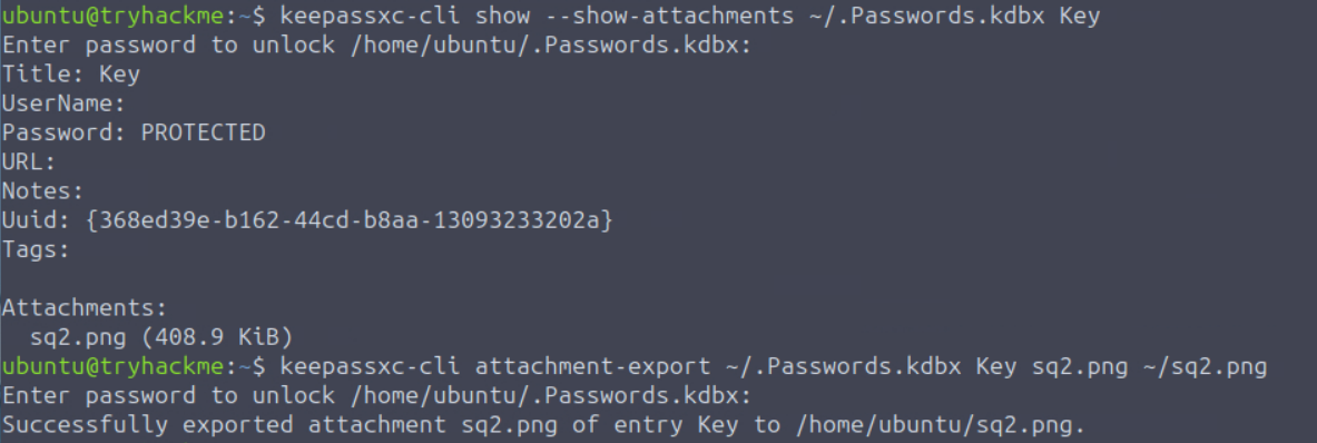 To view the contents of this entry I ran keepassxc-cli show ~/.Passwords.kdbx Key, but the password field was marked as PROTECTED and didn’t display anything useful even when using the -s flag to show protected fields. After trying different flags, I realized the key might not be stored as a password field but as an attachment to the entry. Running keepassxc-cli show --show-attachments ~/.Passwords.kdbx Key confirmed this, revealing an attachment called sq2.png.