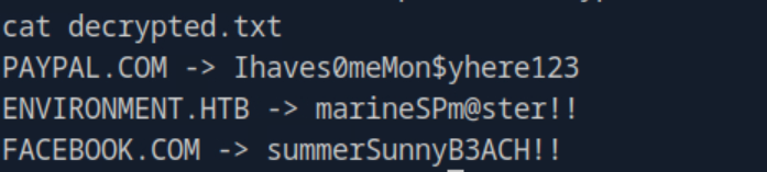 www-data only had limited access to the .gnupg folder but I was able to copy it over to my tmp folder in order to work with the files using cp -r /home/hish/.gnupg /tmp/gnupg. Changing over to the /tmp folder I used the private keys in the gnupg folder to decrypt keyvault.gpg and output it’s contents to decrypted.txt.
