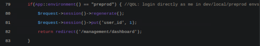 This time the PHP code that was leaked showed an obvious vulnerability in the statement if(App::enviroment()=="preprod", showing that if the environment was set to “preprod” the page would automatically log into the admin account (user_id=1).