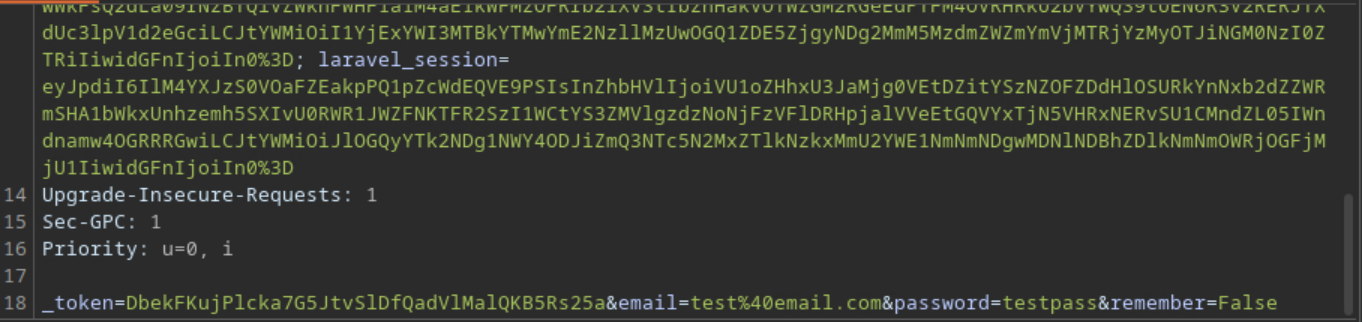This ended up being incredibly helpful as it revealed that the web app was running an instance of Laravel, but it did not give us much information besides that. After some failed attempts at fuzzing common credentials I ended up forcing an error by removing the remember parameter which exposed PHP code.