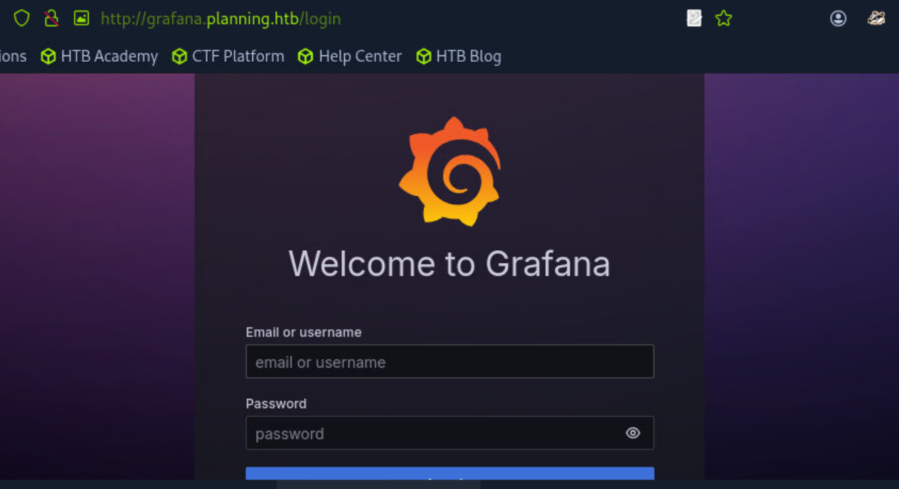 With my nmap scan, sub directory search, and initial exploration of the site all being fruitless I decided to run a subdomain search using the combined_subdomains subdomains wordlist by using the command gobuster vhost -u http://planning.htb -w /usr/share/seclists/Discovery/DNS/combined_subdomains.txt -t 50 --append-domain. The scan was successful, revealing a grafana instance running at grafana.planning.htb. After adding grafana.planning.htb to my hosts file I visited it, finding a log in portal.
