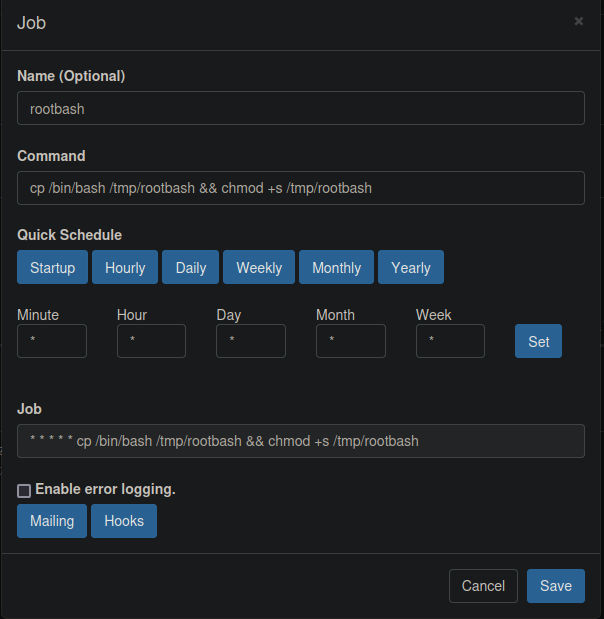 After visiting the web service I was met with a log in portal, which I was able to access with the root / EXTRapHY credentials found earlier. Once inside I realized the service was used for creating cronjobs, which was almost certainly running as root. Through this service I was able to make cronjobs and schedule them to run whenever I wanted, so I made one that would copy the bash binary to /tmp/, while also giving it root privileges and making it executable by the enzo account.