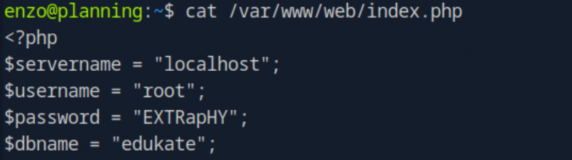 The search returned two files, enroll.php and index.php. enroll.php didn’t have anything interesting, but index.php had credentials for a root account right at the top of the file.
