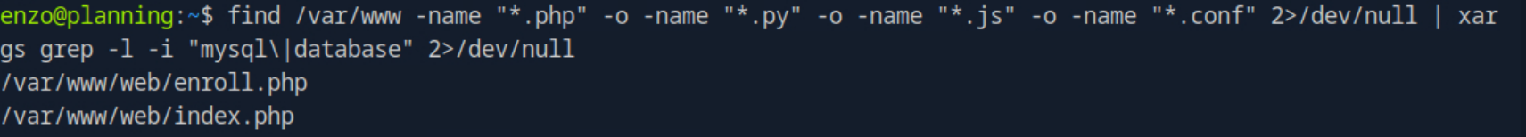 With the knowledge that MySQL was likely running on the machine I decided to search the /var/www/ directory for any files containing references to mysql or databases with the command find /var/www -name "*.php" -o -name "*.py" -o -name "*.js" -o -name "*.conf" 2>/dev/null | xargs grep -l -i "mysql\|database" 2>/dev/null