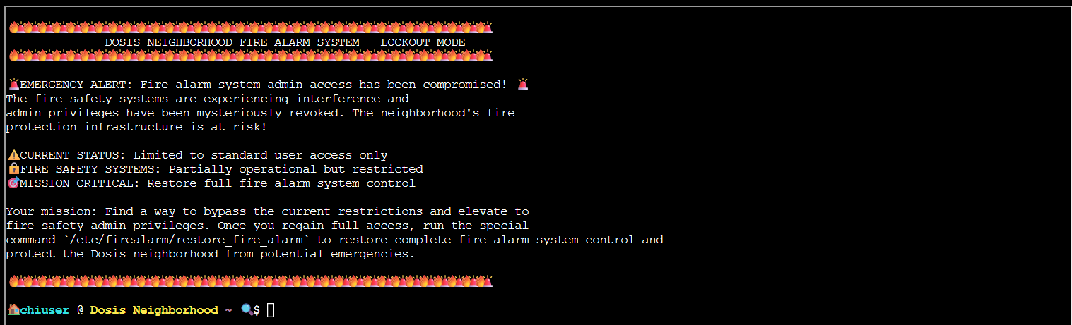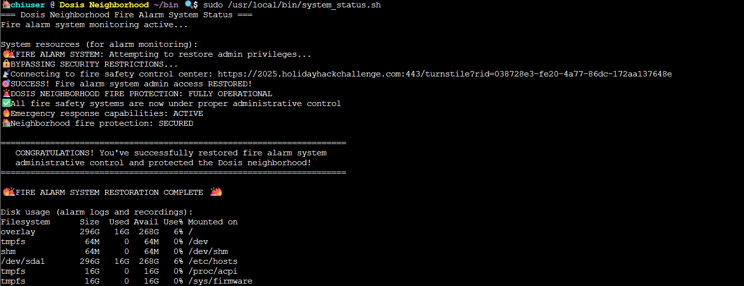 The script itself is not very interesting, but it importantly calls a bunch of system commands WITHOUT using absolute paths. Since /home/chiuser/bin appears first in the secure_path list from the sudo output it means we should be able to replace one of these commands with a malicious script we make in the /home/chiuser/bin directory, meaning it will run when we run /usr/local/bin/system_status.sh. echo is a command built directly into shell so we cannot hijack that one, however free should work. So I made a file at ~/bin/free that when executed runs /etc/firealarm/restore_fire_alarm using this: