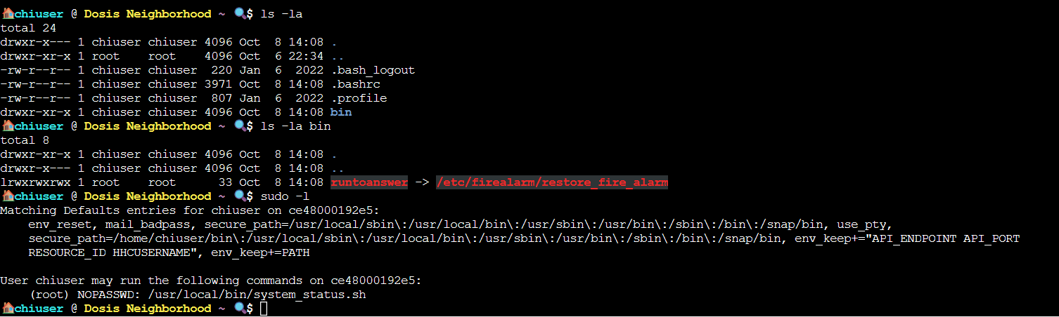 Doing so revealed a few interesting things. The first is that we have a folder in our home directory named bin, which contains a file runtoanswer which is actually a symlink to /etc/firealarm/restore_fire_alarm, the program we are trying to run in this challenge. The second is that the secure_path in sudo includes /home/chiuser/bin FIRST before the system paths, which is a path we have write access to. The third thing of note is env_keep+=PATH in the sudo -l output, which means our path is preserved when running commands with sudo which opens up the possibility of path hijacking. The final thing of note is that we have sudo permissions for the script /usr/local/bin/system_status.sh. Figuring that the system_status script was likely our way to escalate privileges I checked what it does using cat.