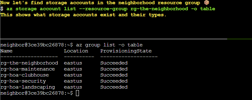 This showed us the 5 resource groups available in this tenant. We are then asked to find the storage accounts with the command az storage account list --resource-group rg-the-neighborhood -o table