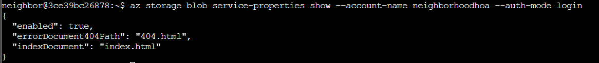Next we are told to search for a static website with the command az storage blob service-properties show --account-name <insert_account_name> --auth-mode login. neighborhoodhoa appeared to be the main HOA website account based on its naming, so I ran the command az storage blob service-properties show --account-name neighborhoodhoa --auth-mode login.