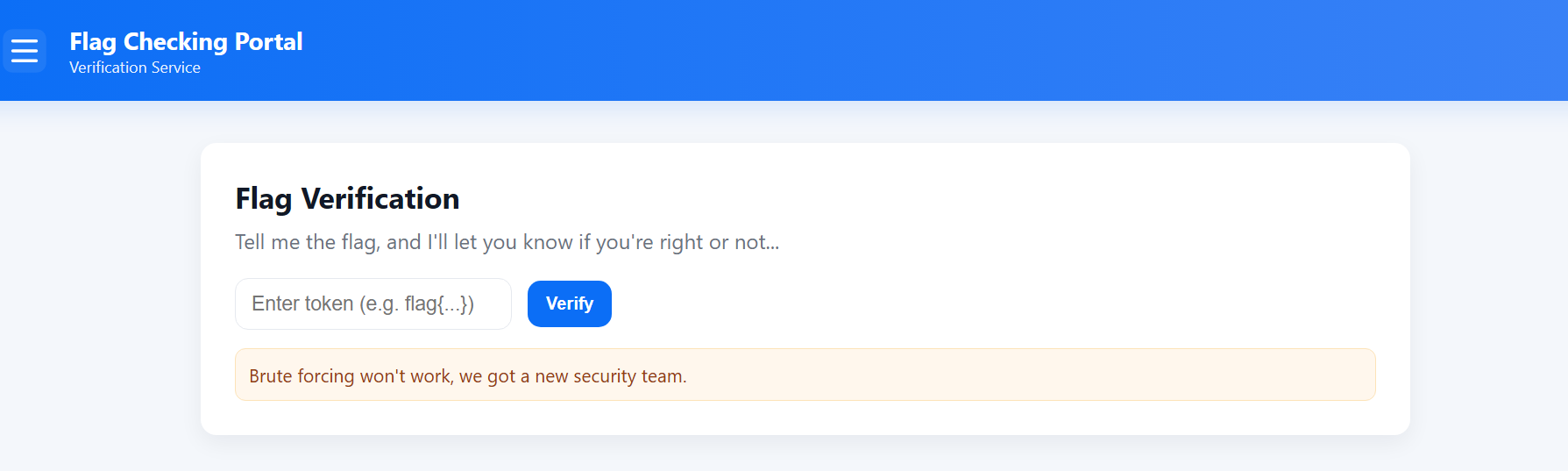 This challenge consisted of a simple webpage that only contained a text input field, where we could paste a string and check if it was the correct flag, as well as a warning telling us that it was futile to brute force answers. However, as is common with CTFs, brute forcing seemed like the only reasonable approach due to the simplicity of the web application.