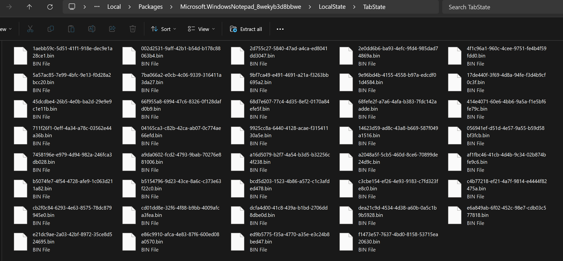 For this challenge we were told a user regularly uses her laptop for note taking and we needed to find information relating to date she has coming up. We were given a partial image of her Windows 11 system which was mostly empty and devoid of anything interesting. However, looking at the folder\C\Users\Tabby\AppData\Local\Packages\Microsoft.WindowsNotepad_8wekyb3d8bbwe\LocalState\TabState I found 39 .bin files which seemed interesting. This specific folder is the one Windows Notepad uses to store automatic tab state back ups of notes in case if the application closes without the user saving, meaning that even though they are .bin files they most likely contain readable ASCII text.