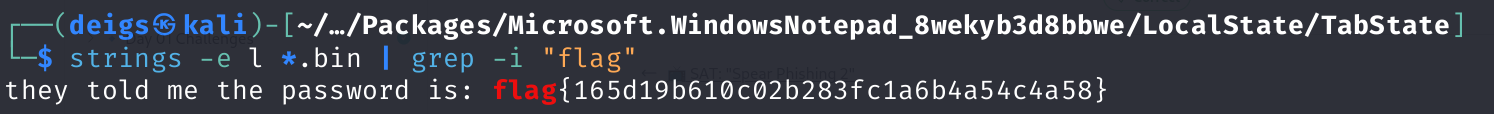 Copying the files over to my Linux machine I attempted to read one using the cat and strings commands, but it just returned gibberish, because Windows Notepad uses UTF-16 Little Endian encoding instead of the usual UTF-8. To overcome this I ran the strings command with the -e l flag for UTF-16 Little Endian, which allowed me to successfully read one of the notes. Figuring the flag would follow the usual Huntress CTF flag format of starting with the word “flag” I used this command to read through all the files and pipe the output into a grep search for the string “flag” strings -e l *.bin | grep -l "flag"